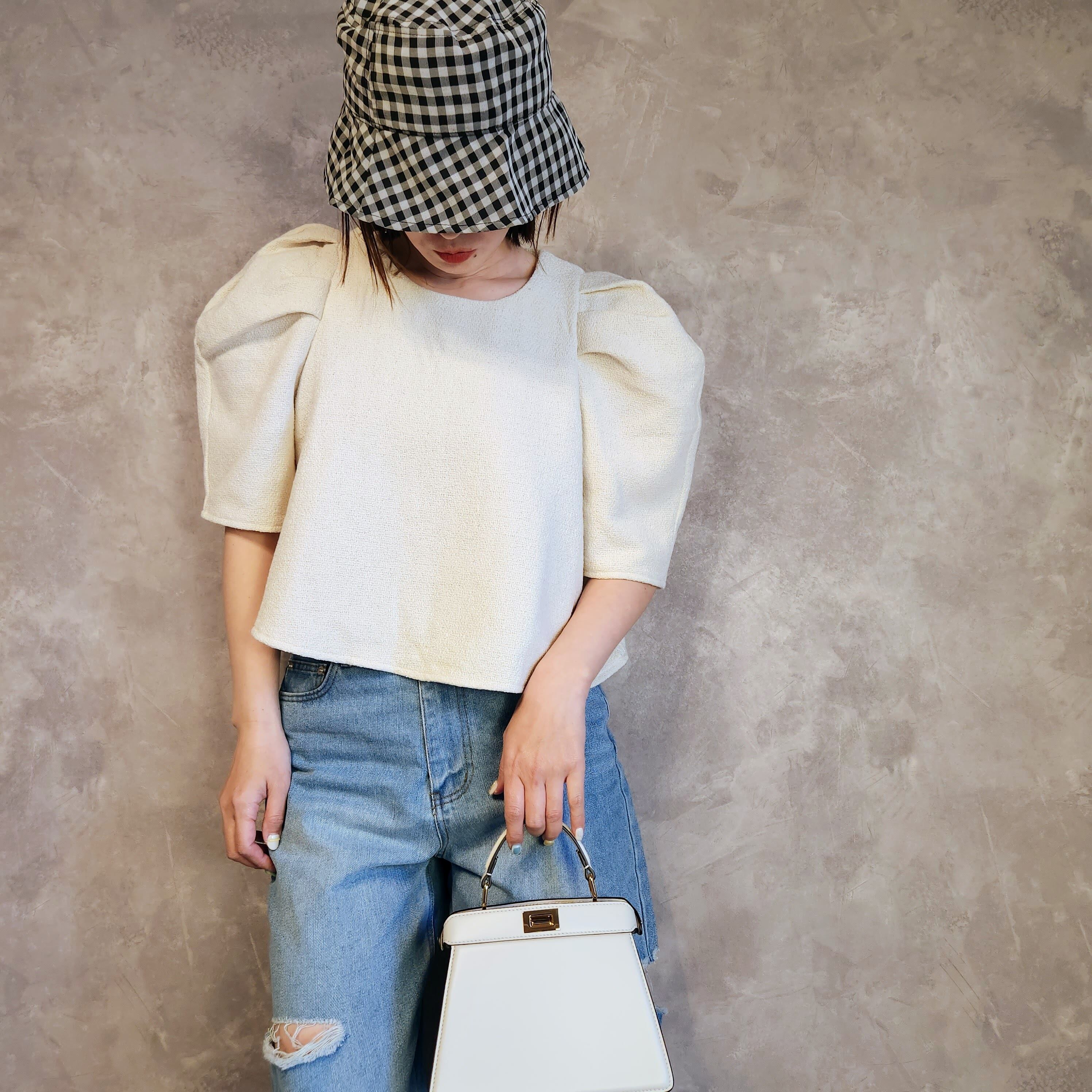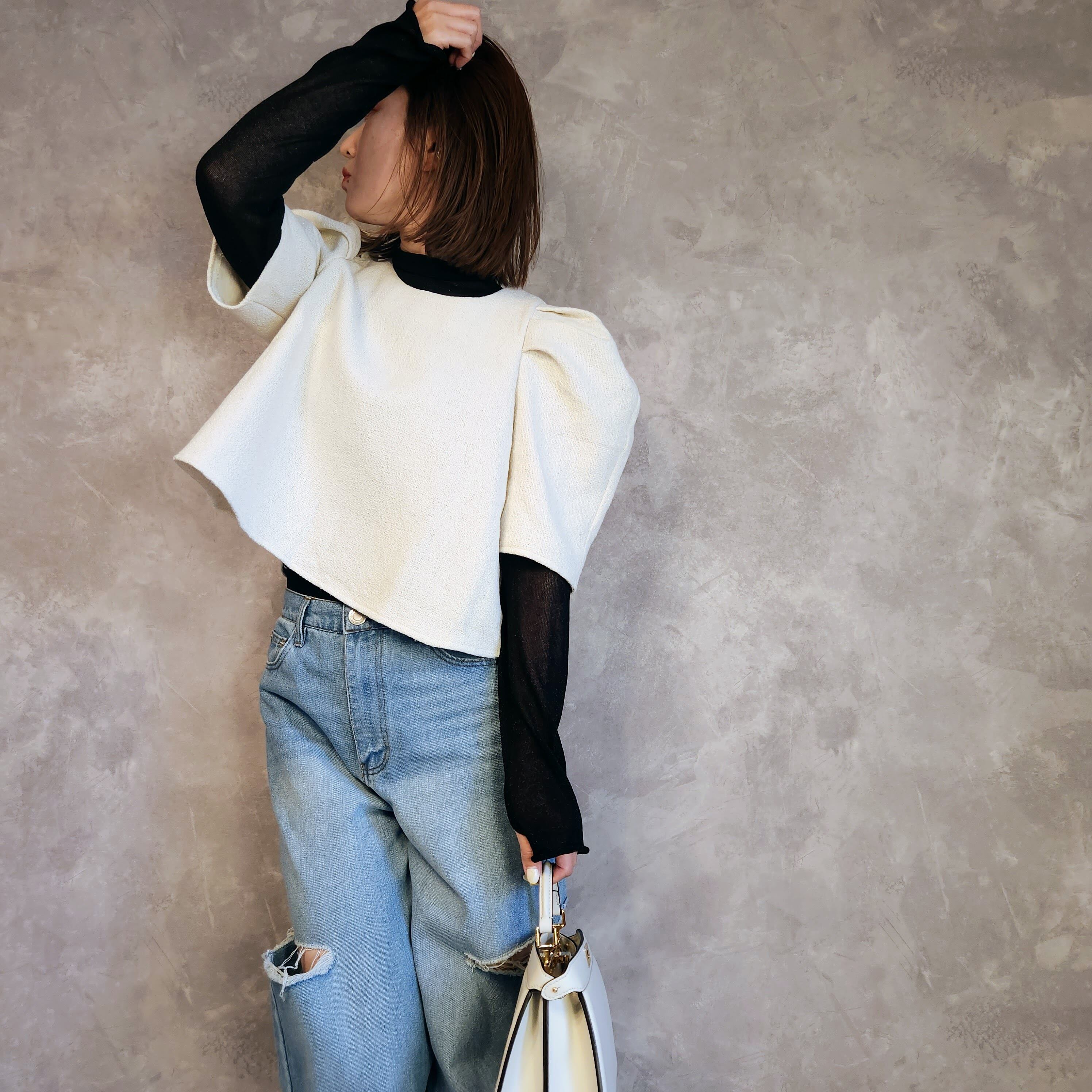 パワーショルダーがふんわり二の腕を可愛くカバー。