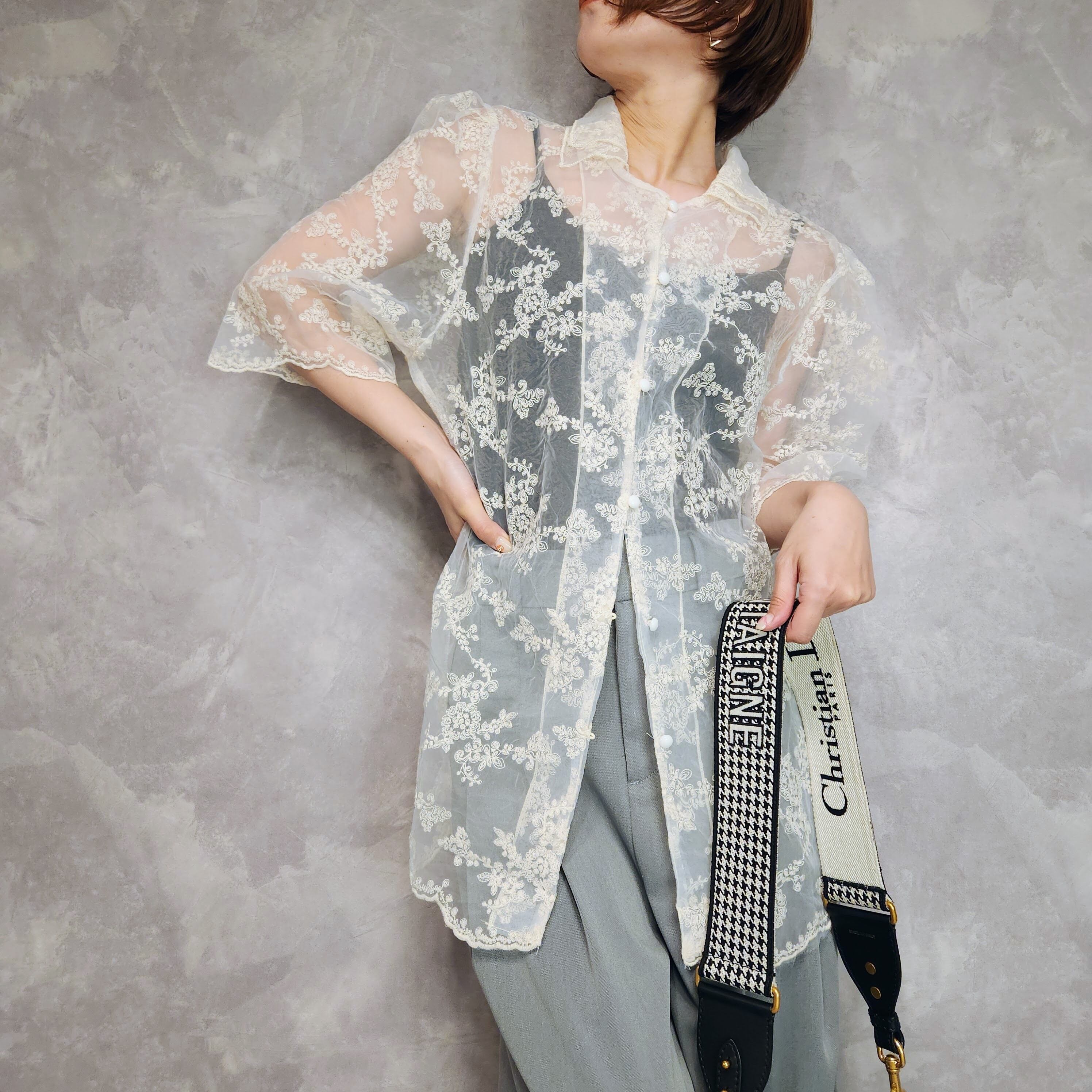 軽やかな裾スカラップのデザインが魅力のシアーブラウスです。