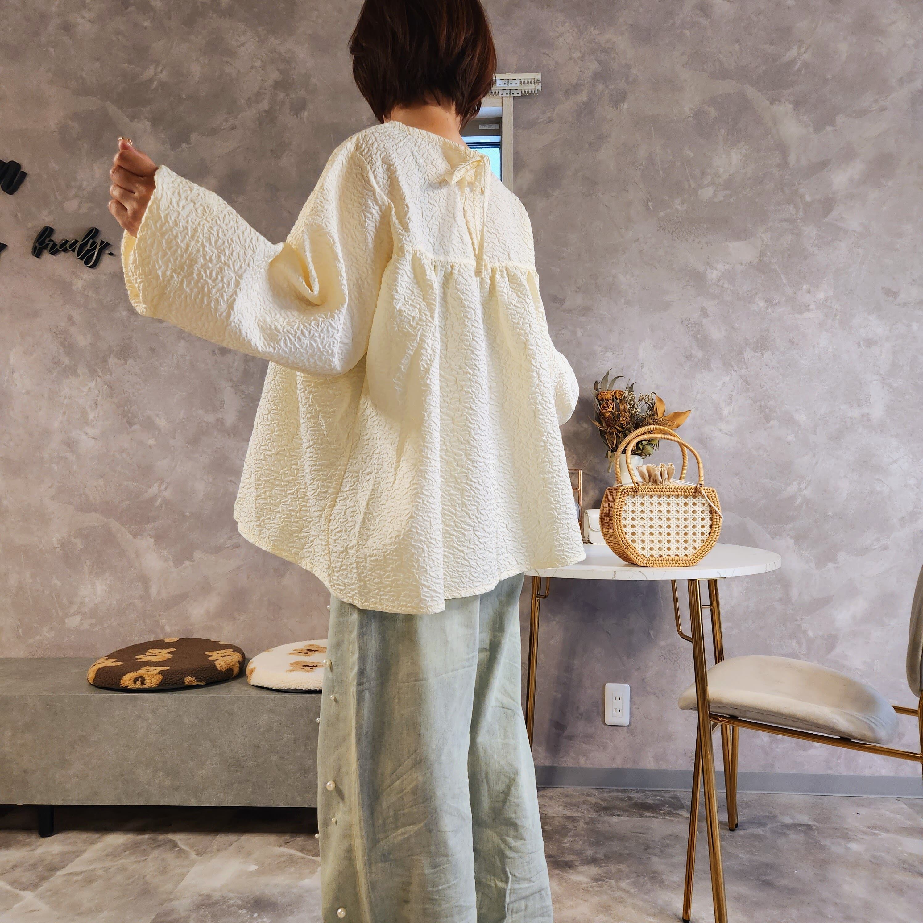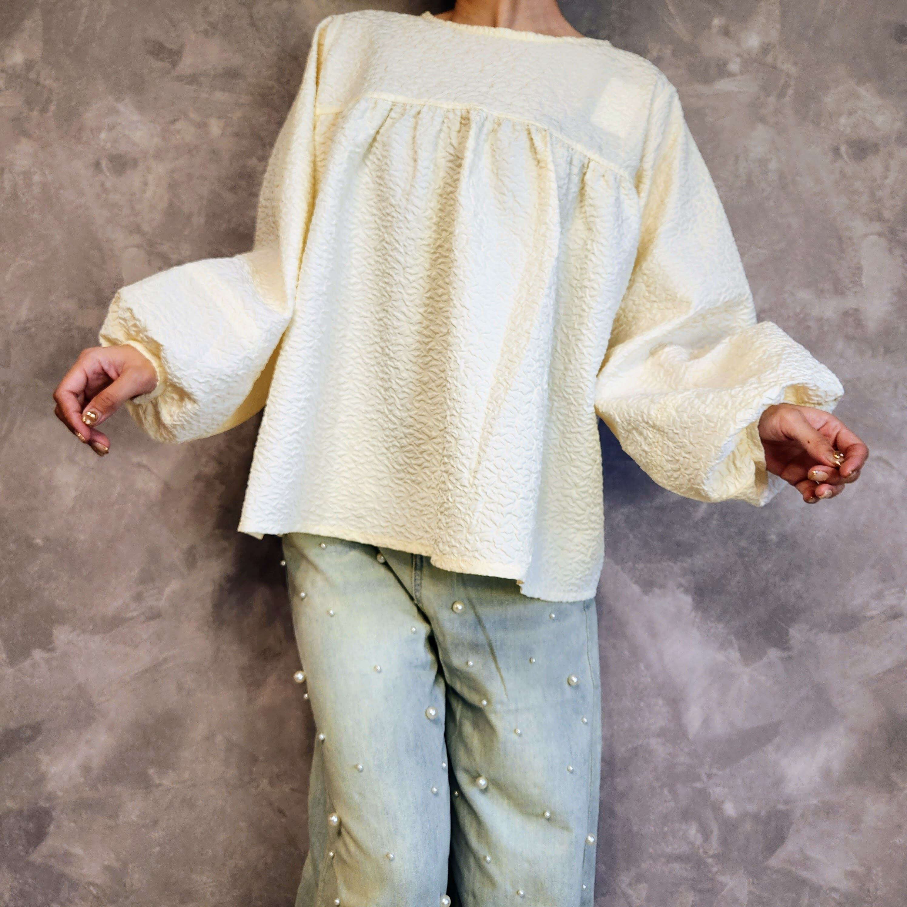 膨れジャガード切り替えギャザーブラウス☆アイボリー