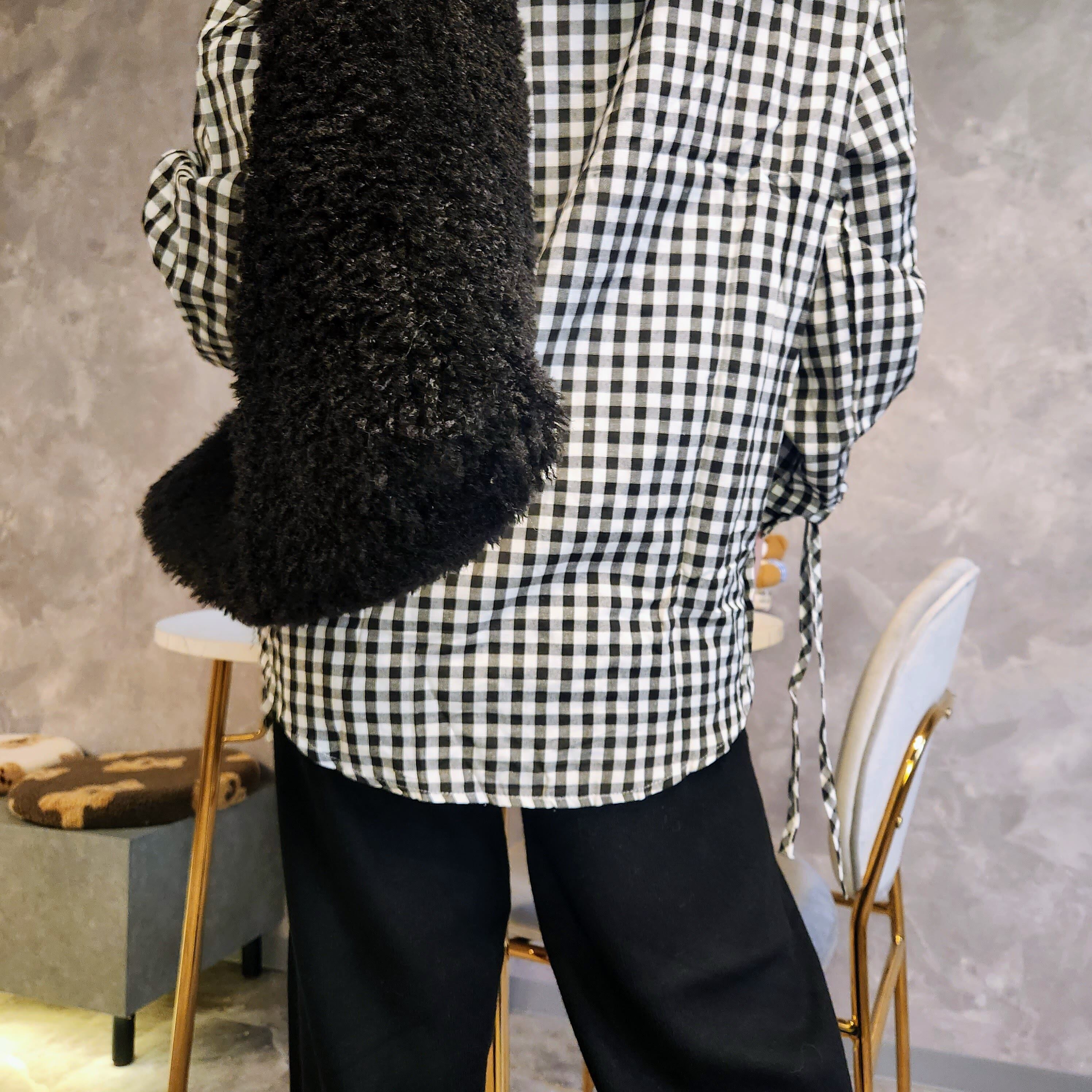 コーデの主役になるギンガムチェック柄のビッグカラーブラウス。