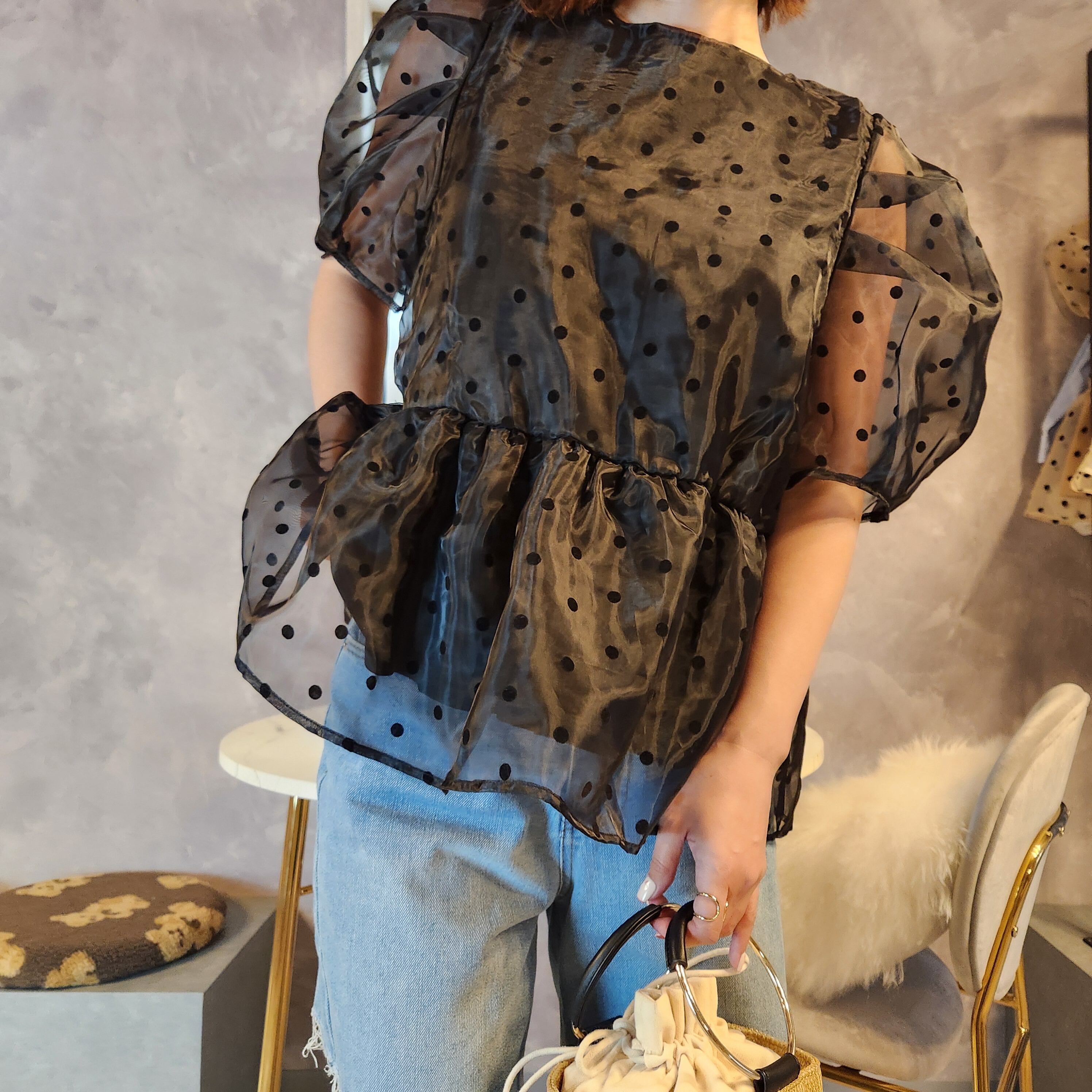 ボリューム袖ドットチュールレイヤードトップス☆ブラック